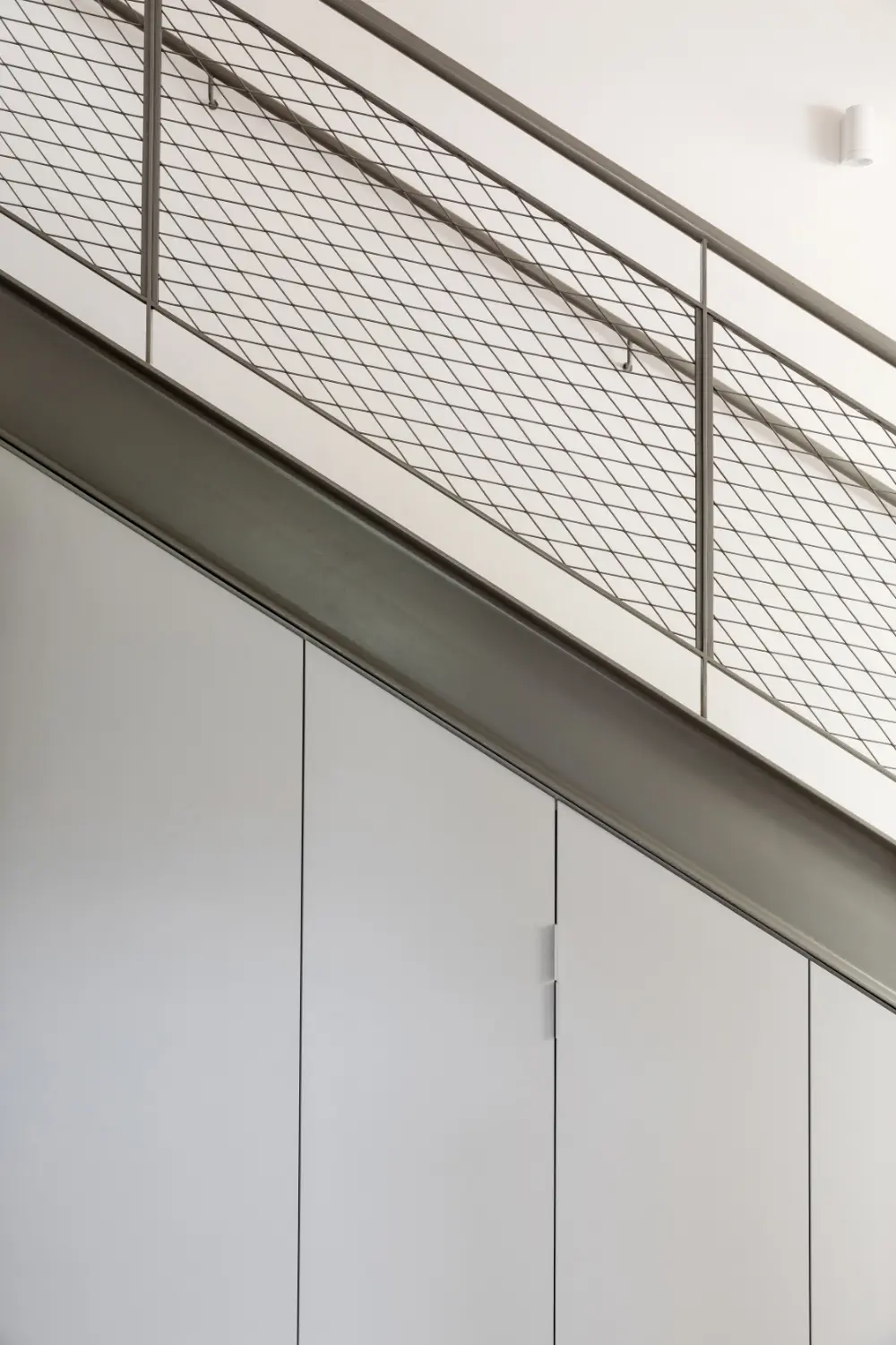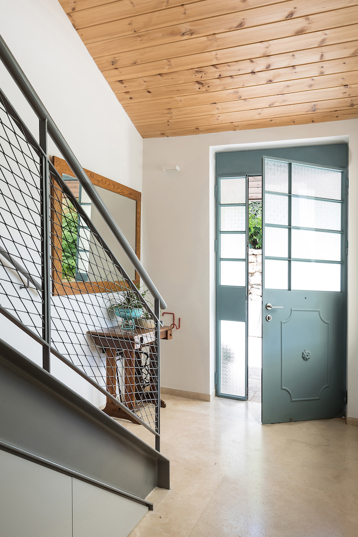 לפיכך נבחרו חומרים טבעיים, נאמנים לבניה המקורית של הבית ובצבעוניות מאופקת- רצפת אבן בגוון חול, מדרגות מתכת ועץ, חלונות אלומיניום בלגי, ספריית עץ לבנה ועוד.