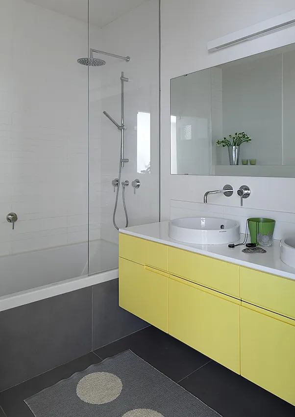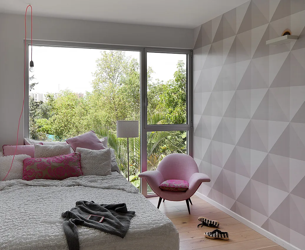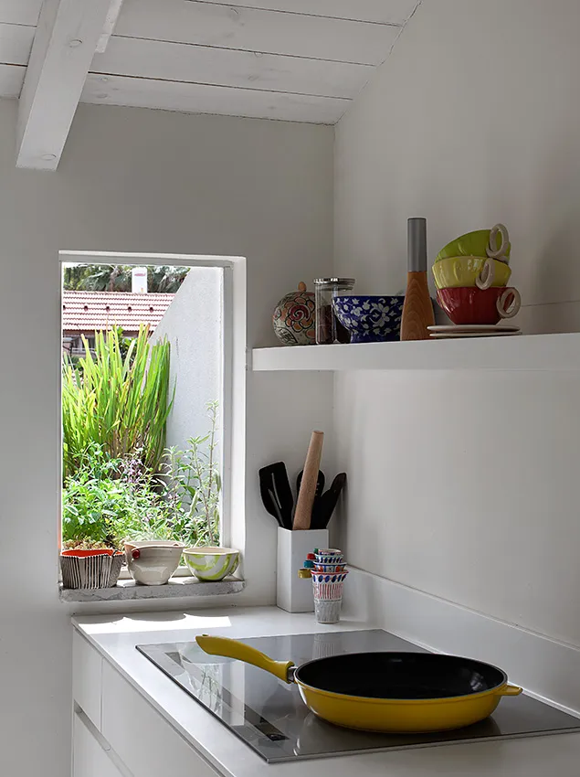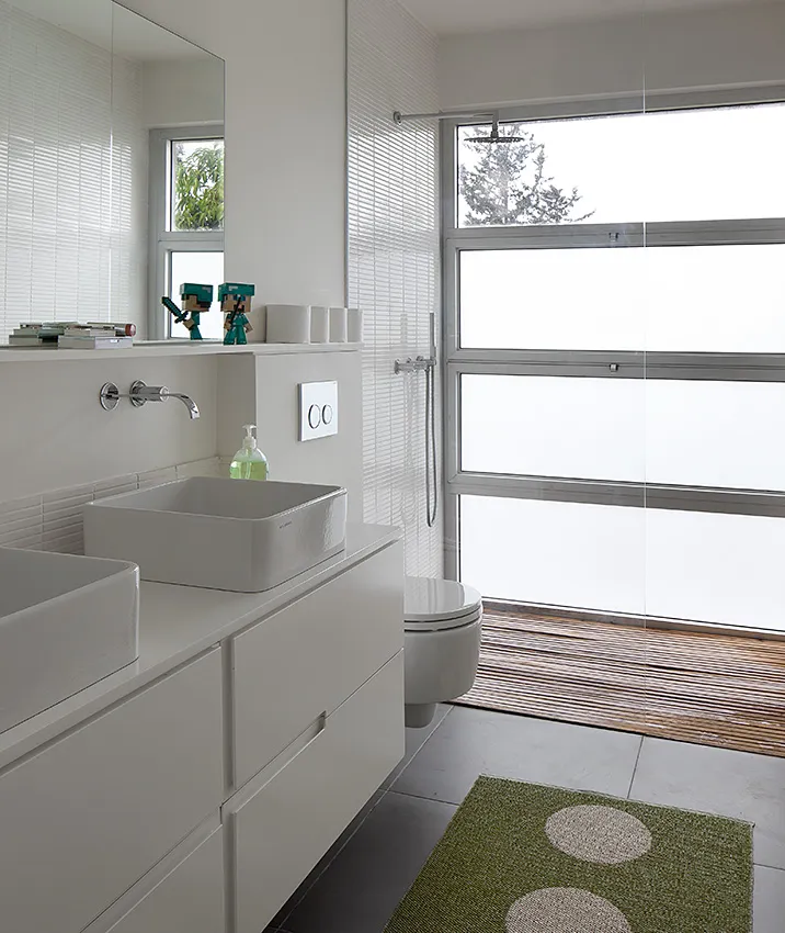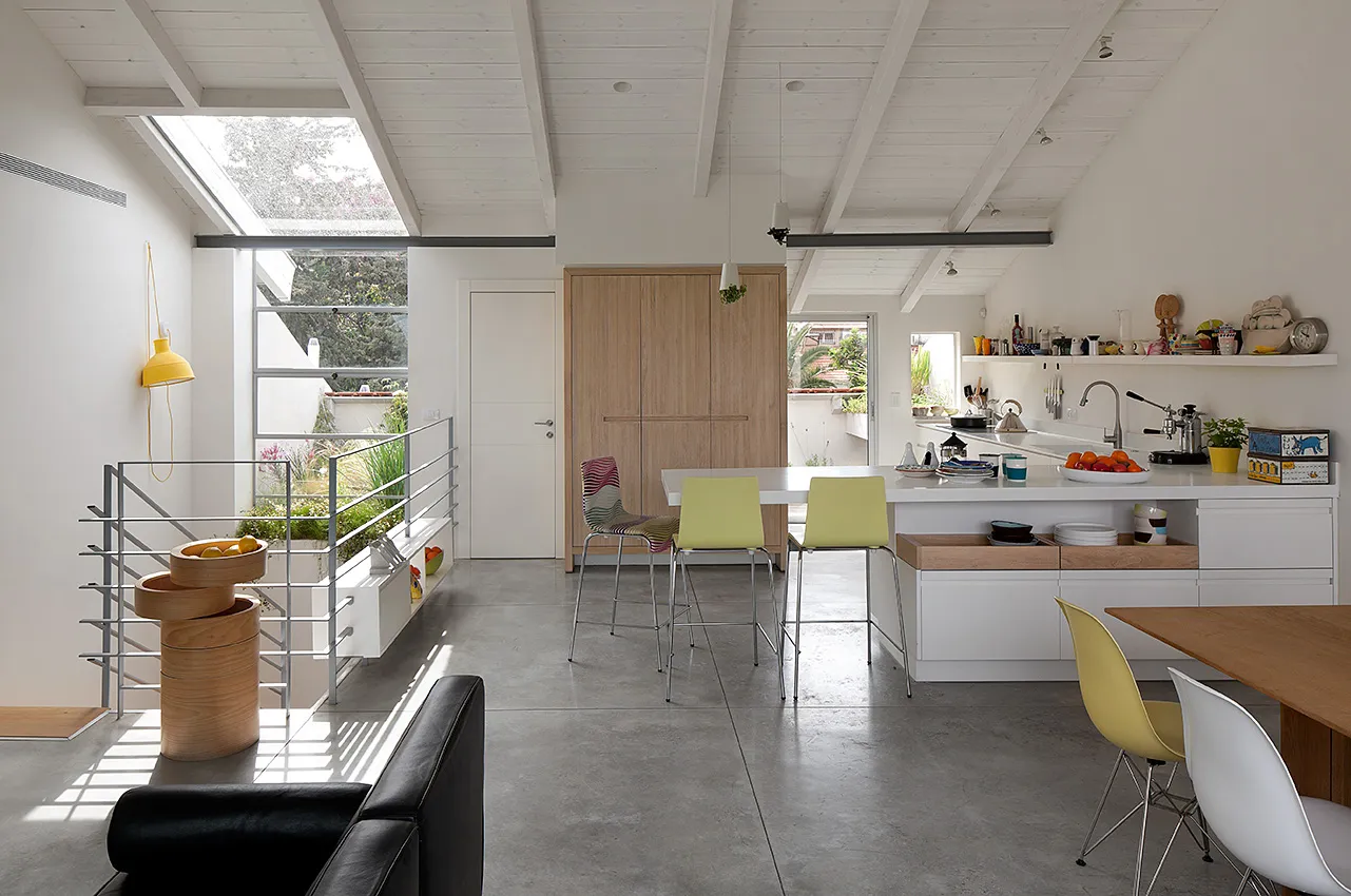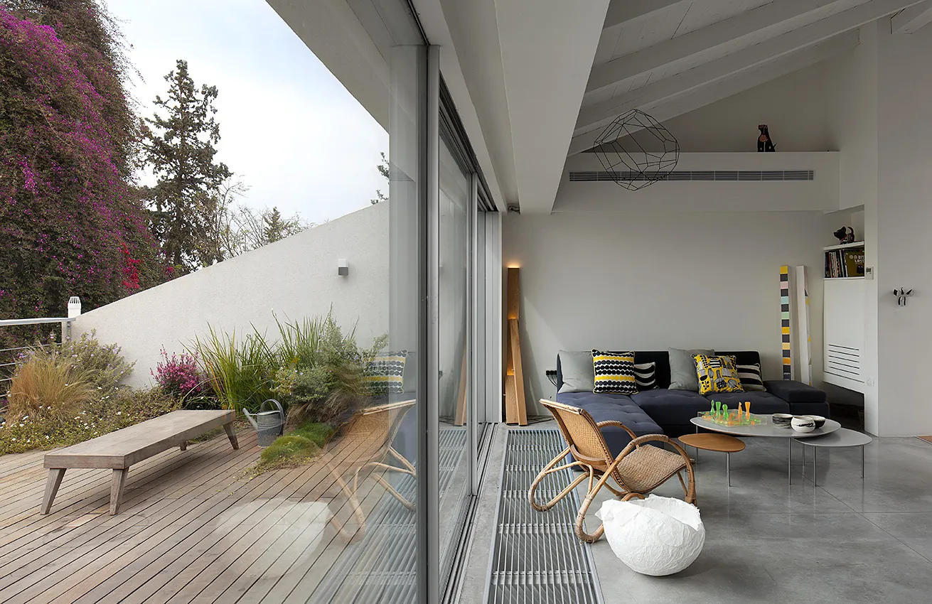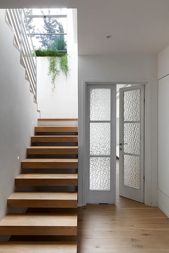 עם העליה במדרגות נחשף נוף מפתיע- ירוק ופתוח- בזכות מיקומו הגבוה של הבית בשכונה. כדי לאפשר חיבור מלא בין הפנים לחוץ, תוכננה ויטרינה רציפה עם פרופילים דקים לאורך כל חזית הבית, ללא עמודים. לשם כך נדרש פתרון הנדסי: קורה גדולה מהמקובל נוצקה מעל הפתח, ונוצלה גם כסינר תאורה וכנישה להסתרת וילון.