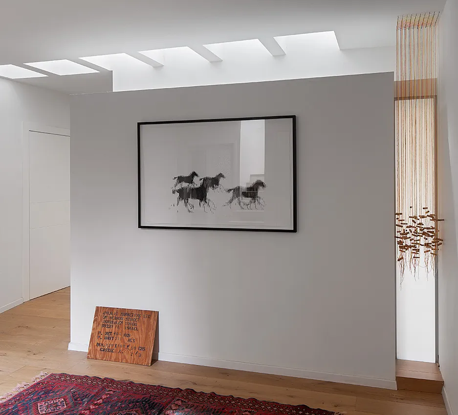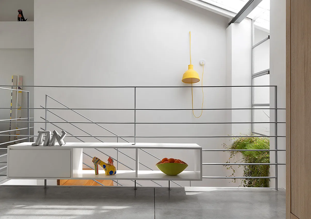 האלמנט השני- פתחים ברצפת הסלון, הסמוכים לויטרינה הגדולה ומכוסים רשת פלדה, דרכם חודר אור רך לקומת הכניסה שמתחת.