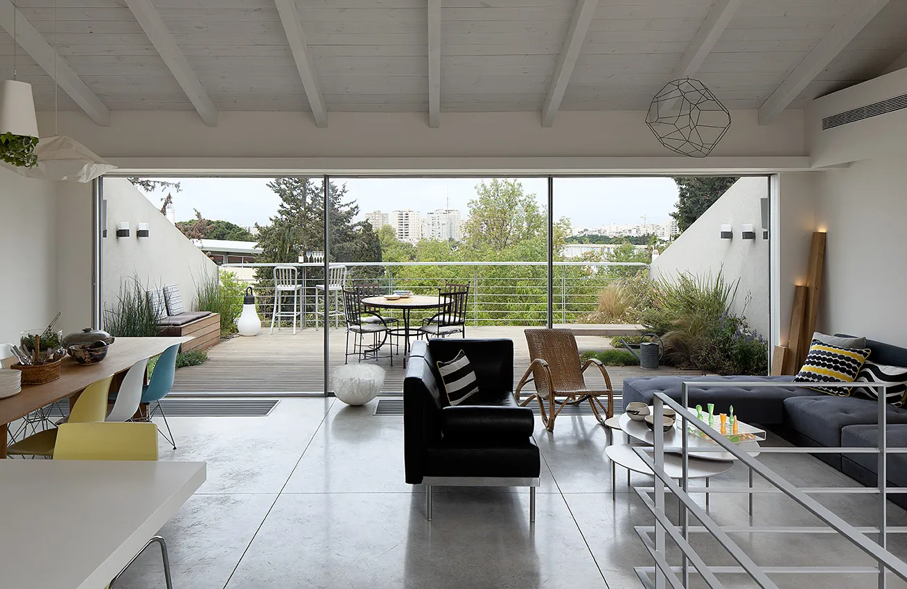 כך, במשך רוב ימות השנה, המרפסת נפתחת אל הסלון והקומה הופכת לחלל אחד גדול מרווח ושטוף אור.