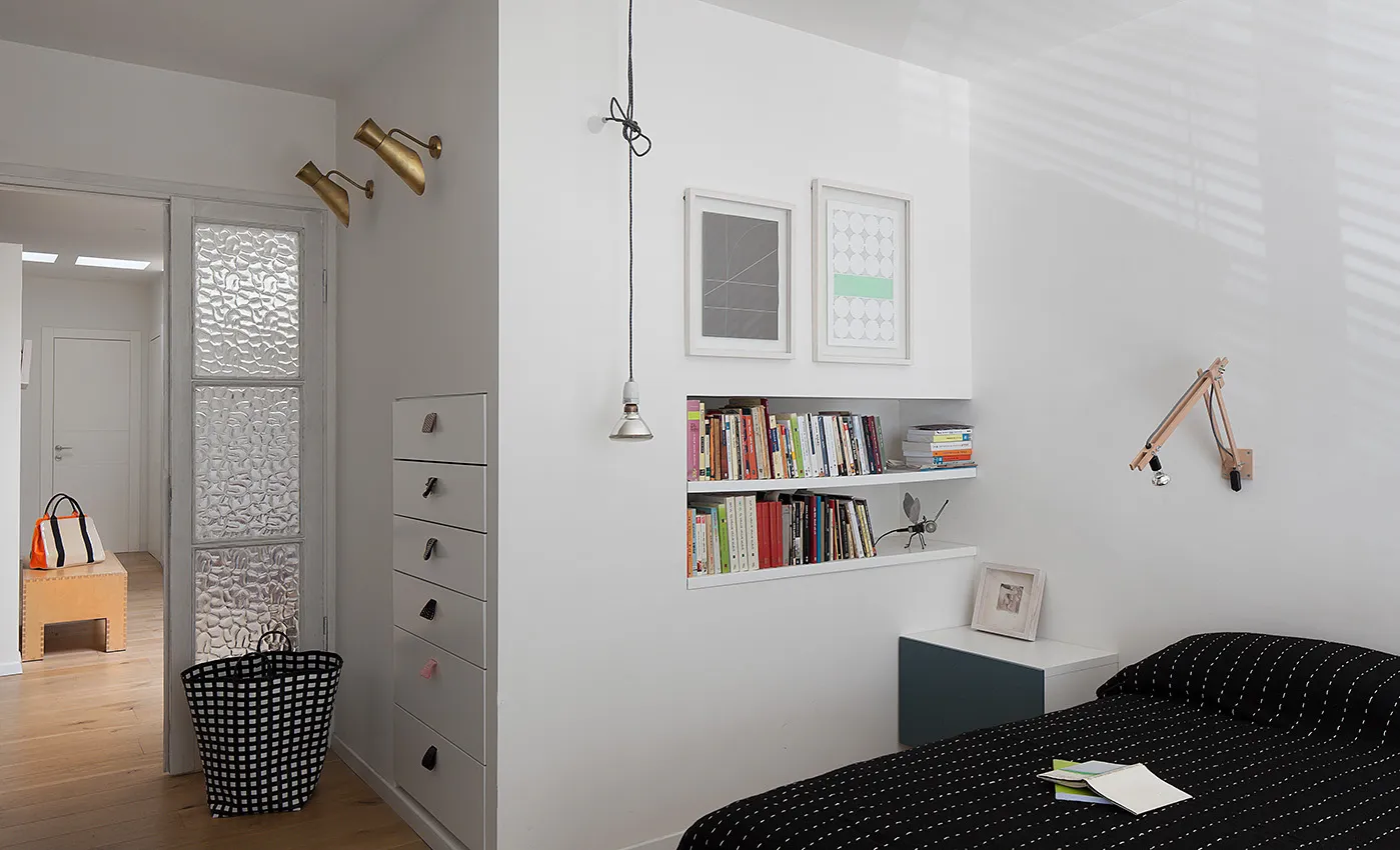 הראשון- חלל המדרגות, שנקבע על החזית המזרחית ובה נפער חלון גדול שמתחיל בפודסט וממשיך אל סקיילייט בתקרה. האור הישיר הנשפך דרך הפתח יוצר כניסה מוארת וחמה. ערוגת שתילים קטנה פורצת מתוך החלון ומתחברת לגינה שמחוצה לו, מכניסה צבע ושמחה.
